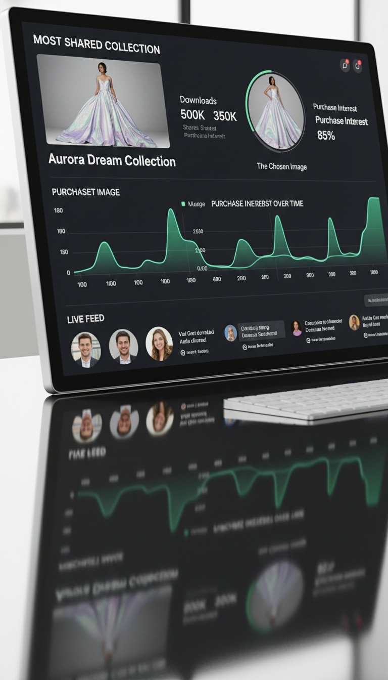É o seu painel de inteligência de desejo. Você saberá em tempo real quais peças da sua coleção estão sendo mais fotografadas e compartilhadas. Se uma joia ou vestido tem alta taxa de "ativação", mas baixa venda, você detectou um problema de preço ou ajuste. Se tem alto compartilhamento, você tem um best-seller nas mãos antes mesmo do estoque acabar. Dados reais sobre o comportamento do desejo.